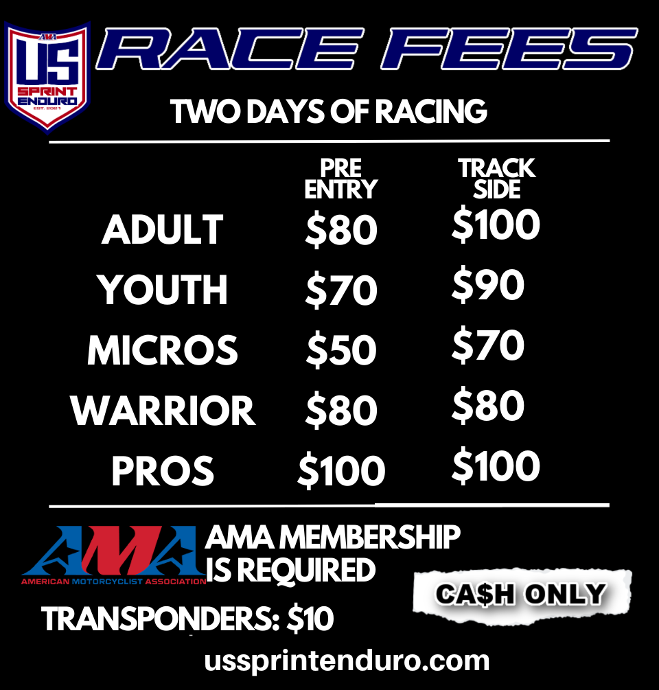 US Sprint Enduro is Sanctioned by the American Motorcyclist Association. We will be able to sell you a membership at the track if you do not already have one.
