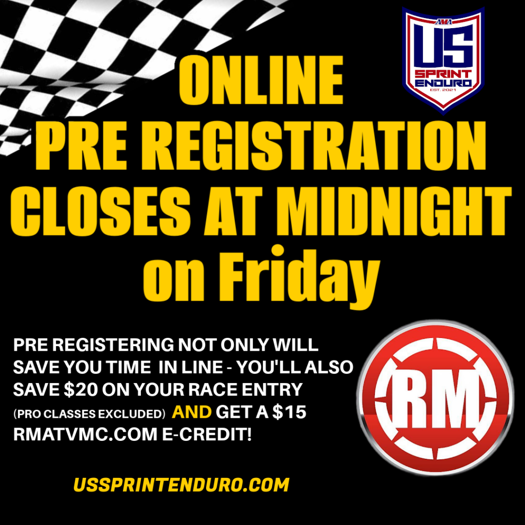 REFUNDS: Due to the Sprint Enduro format not being able to exceed a certain number of racers, there are no refunds, and your race entry cannot be moved to the next round. We encourage you to pre-register only if you are sure that you can make the event.